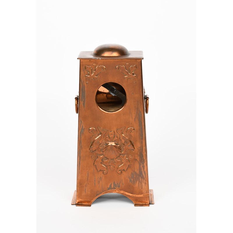 A Newlyn Industrial Class repousse copper mantel clock, tapering, rectangular form, repousse decorated with scaly fish flanking a scallop shell, with applied loop handles, stamped Newlyn, 27.5cm. high