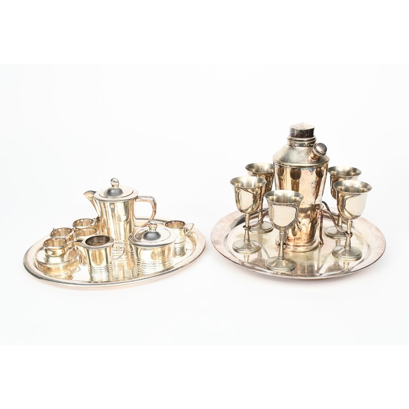 An Art Deco English electroplated cocktail shaker set, hydrant style shaker with fitted tray and six goblets, and a continental electroplated coffee set for six, comprising coffee pot and cover, milk-jug, sugar basin and cover, six cups and saucers on a tray, stamped marks, 24.5cm. high (25)