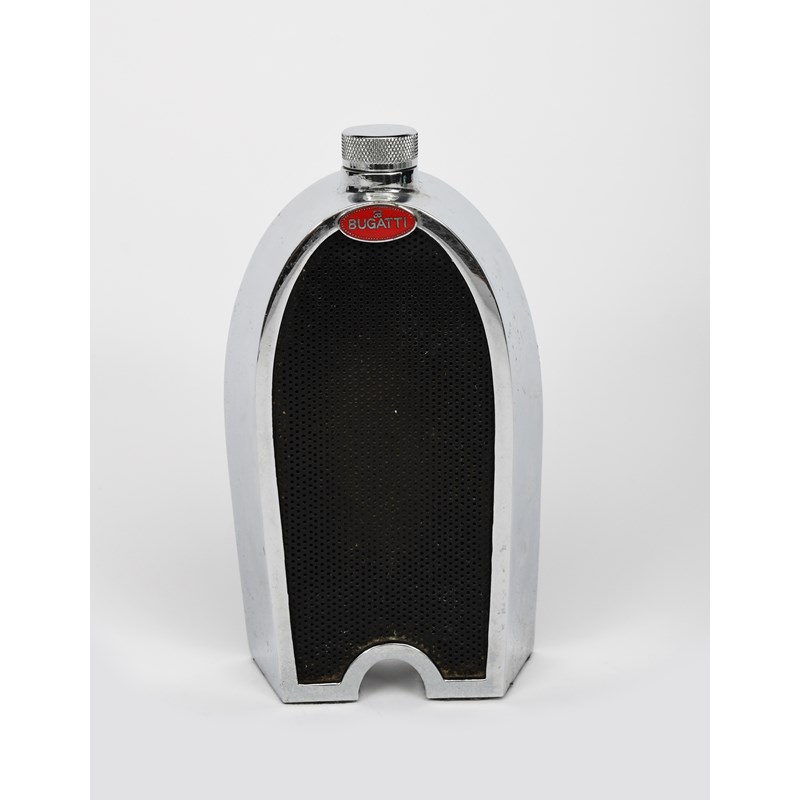 A Bugatti radiator flask probably Ruddspeed, chromed metal with enamelled badge, unsigned, 19.5cm.