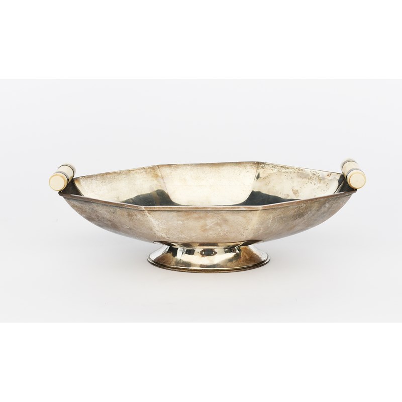 λ An Art Deco Hukin & Heath silver and ivory footed dish, octagonal footed form, applied with ivory handles, stamped marks, Birmingham 1937, 27cm. wide
