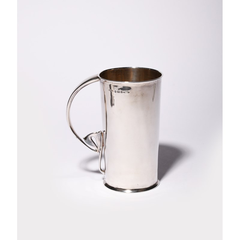 A Liberty Cymric silver tankard designed by Archibald Knox, model no.2188, cylindrical form with cast Art Nouveau foliate handle, stamped marks, Birmingham 1904, 15.5cm. high