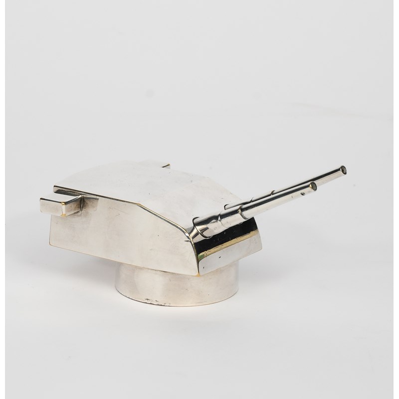 A chromed metal warship's gun paperweight, with two cannons, unsigned 12cm. wide