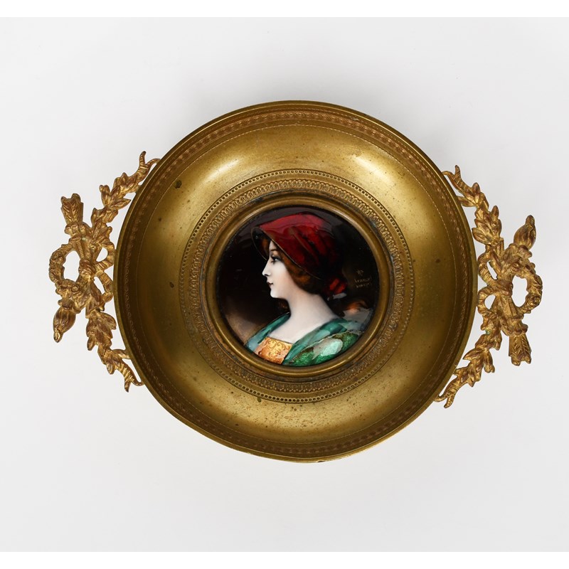A Limoges enamel mounted metal dish by Lebrun, the circular bowl surmounted with cast foliate handles, set to the well with a circular enamel of a lady in colours and gilt, signed with monogram and Lebrun Limoges, 16.5cm. wide