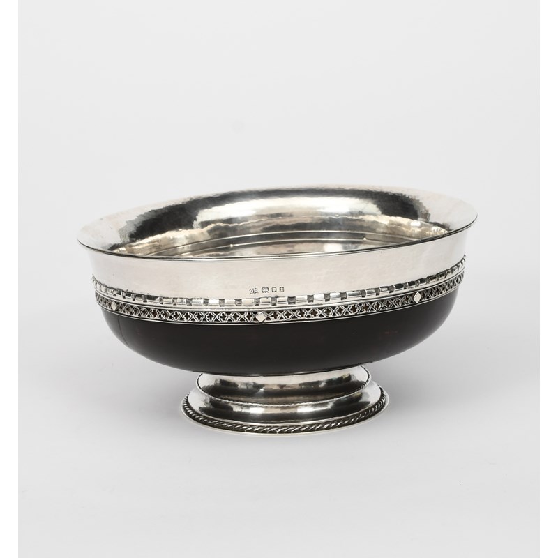 A large Omar Ramsden silver mounted walnut Mazer bowl, the silver rim with crenulated and quatrefoil bands, the stepped silver foot with rope bands, stamped marks, OR, London 1934, and Omar Ramsden Me Fecit to base, 22cm. wide, 10.5cm. high