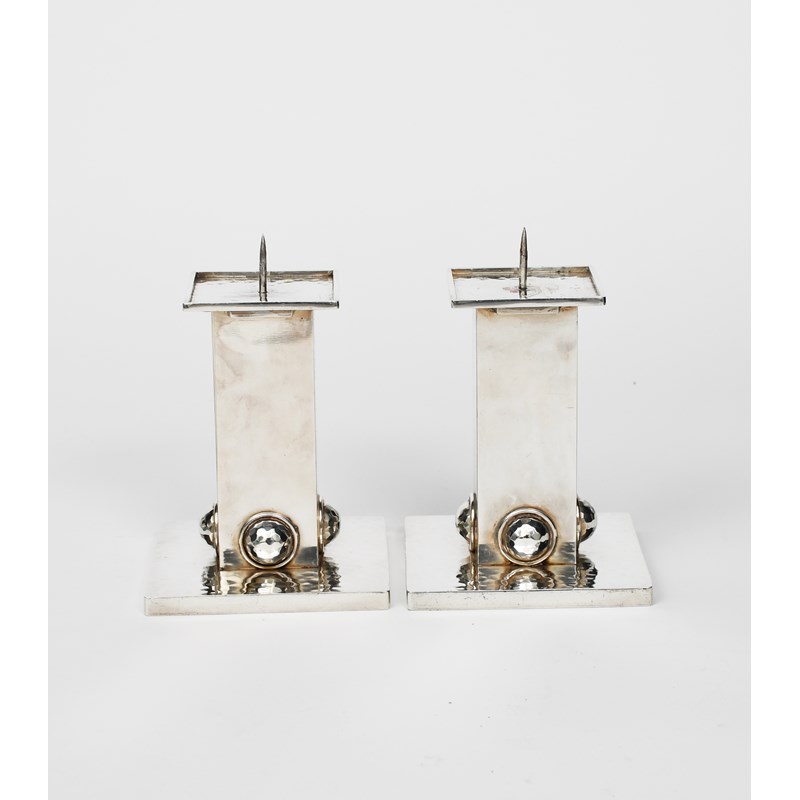 a pair of Modernist silver plated candlesticks, square section stem with hammered hemi-spherical panels to the base, with hammered square base and drip pan,