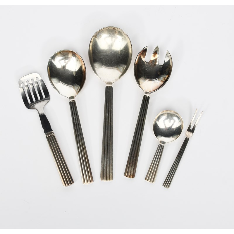 A Georg Jensen silver Bernadotte part service designed by Sigvard Bernadotte, comprising; serving spoon, pair of servers, caddy spoon, sardine server and a pickle fork, stamped marks, 20.7cm. long (serving spoon), (6)