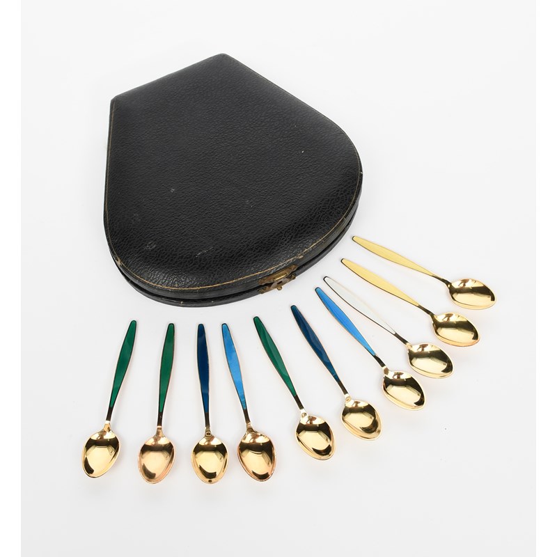 A set of ten Georg Jensen silver gilt tea spoons, the handles enamelled in yellow, green, blue and