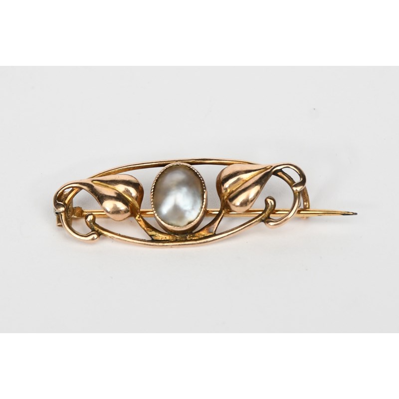 A yellow metal and mother of pearl brooch the design in the manner of Archibald Knox, cast with leaves flanking central polished mother of pearl cabochon, unmarked, 3cm wide
