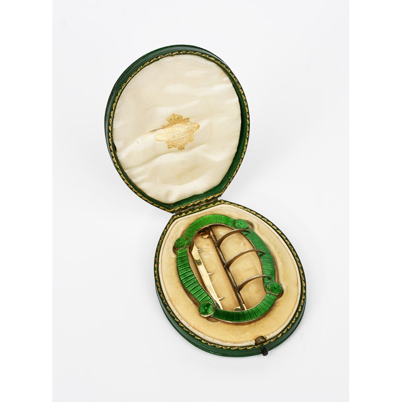 A Child and Child silver and green enamel buckle, in original presentation case, stamped marks,