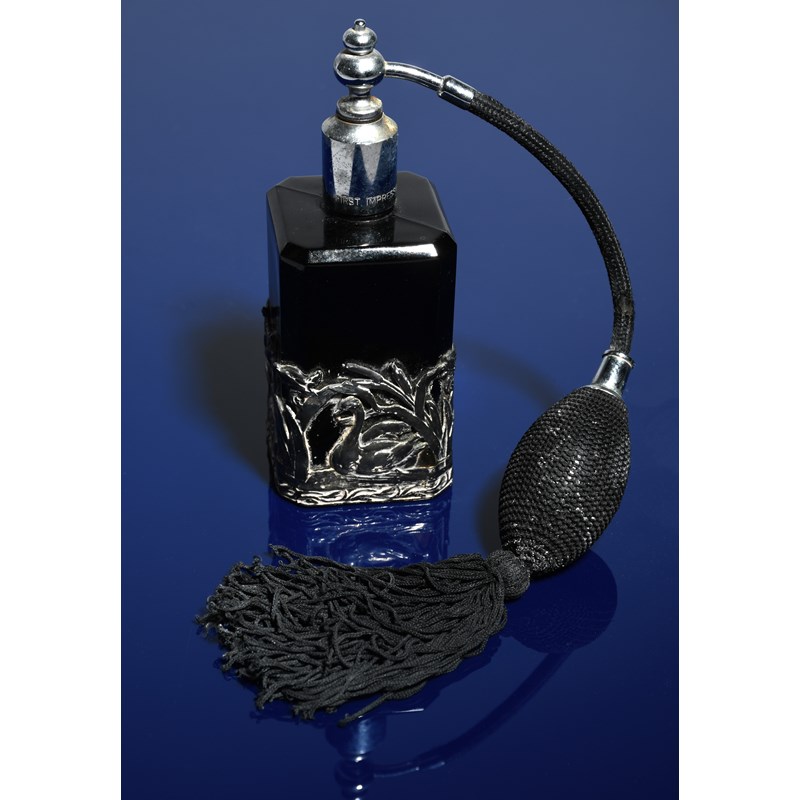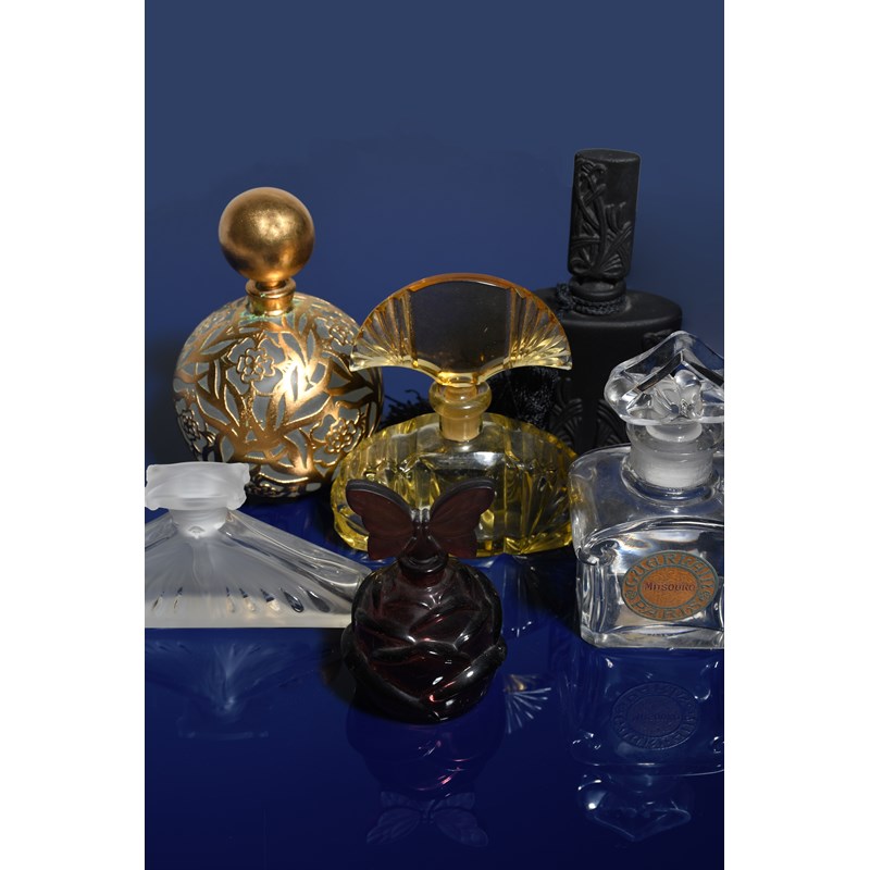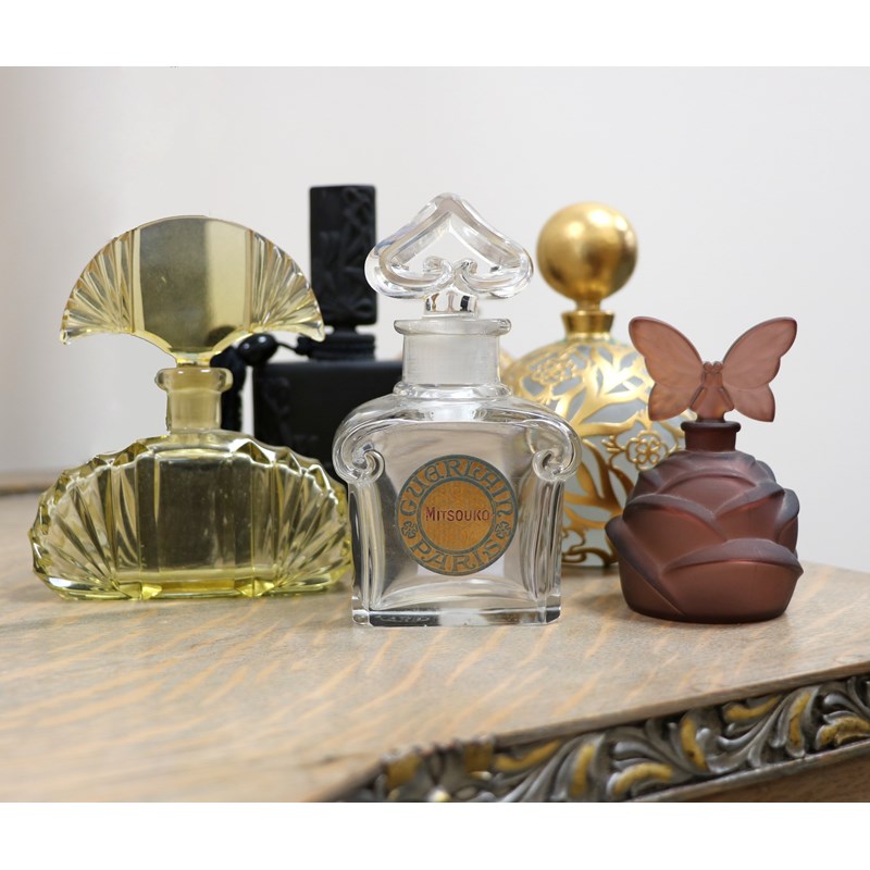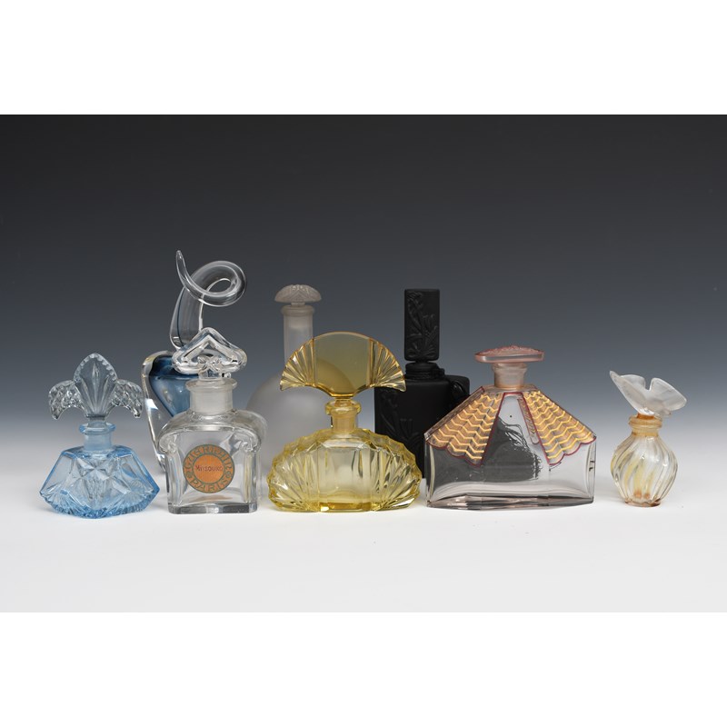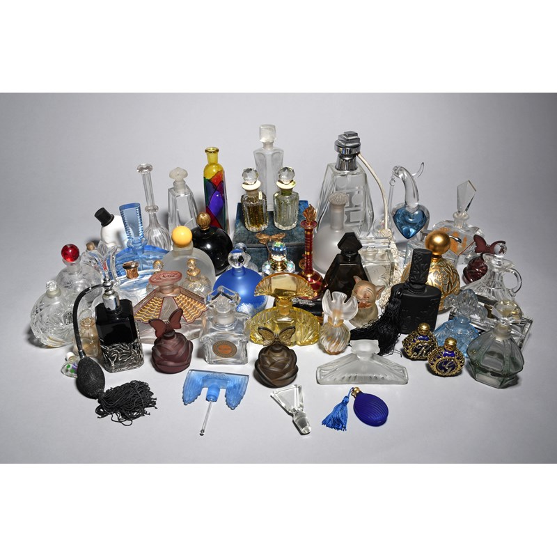 'L'Air du Temps' a Nina Ricci clear and frosted glass scent bottle and stopper designed by Marc Lalique and Robert Ricci, the stopper modelled as a bird in flight, a 'Mitsourko' Guerlain Paris scent bottle by Baccarat designed by Raymond Guerlain, a Bonzo Dog novelty scent bottle and stopper, a large chrome mounted perfume atomiser acid etched with Art Deco design and a collection of scent bottles, atomisers, and dressing table accessories various marks, 12cm. high (Guerlain bottle), (53)