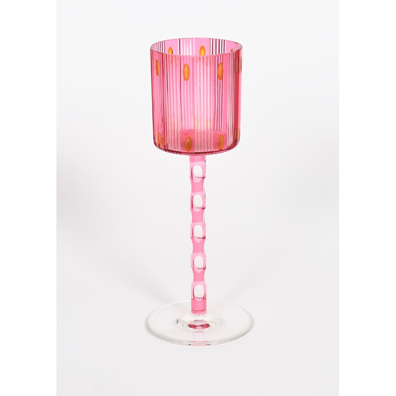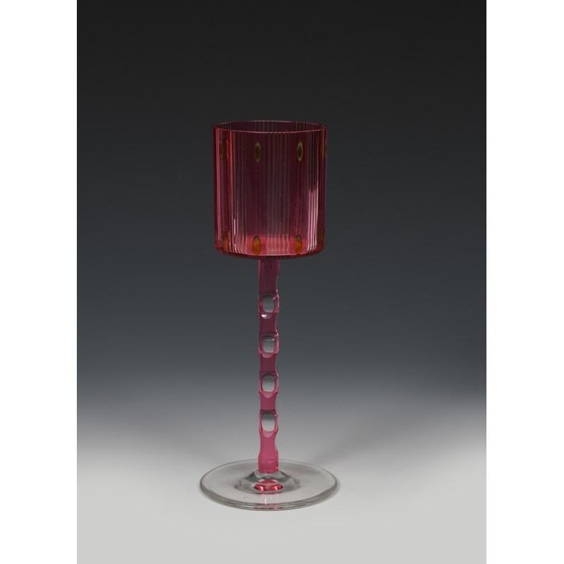 A Meyer Neff hock glass designed by Otto Prutscher, clear glass with pink and amber glass overlay, the cylindrical bowl with vertical cut bands alternating with amber glass elliptical panels, unsigned, 21cm. high