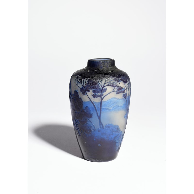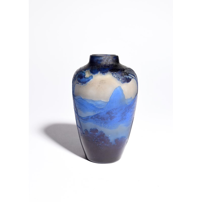 Rio De Janeiro an Art Nouveau Galle double-overlay cameo glass vase designed by Emile Galle, shouldered form, opaque glass cased in blue and purple, acid-etched with a lakeside landscape with Sugarloaf Mountain, cameo Galle signature and acid etched Rio De Janeiro title, 14.5cm. high