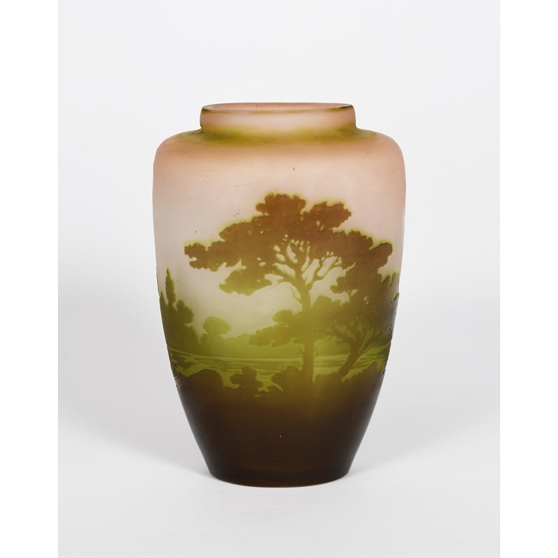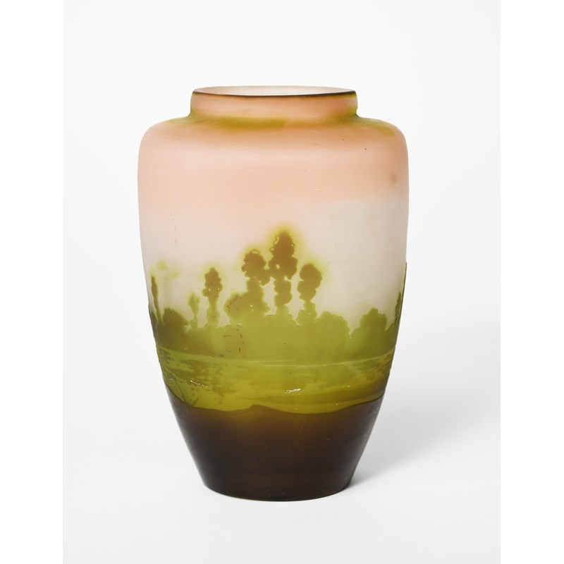 An Art Nouveau Galle cameo glass vase designed by Emile Galle, shouldered pink glass cased in yellow and green, acid etched cameo lakeside landscape, cameo signature Galle to side, 19.5cm. high