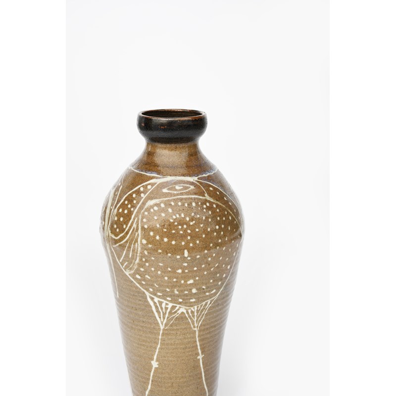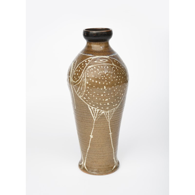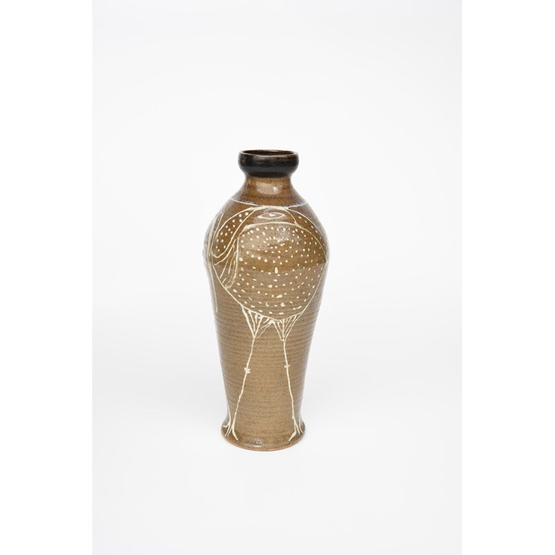 'Dark Celadon White Birds' a fine tall stoneware vase, slender shouldered cylindrical form with stork neck and collar rim, slip decorated with three curlew in white with lavender translucency, on an oatmeal ground, impressed seal mark, paper exhibition label no.6, 40cm. high