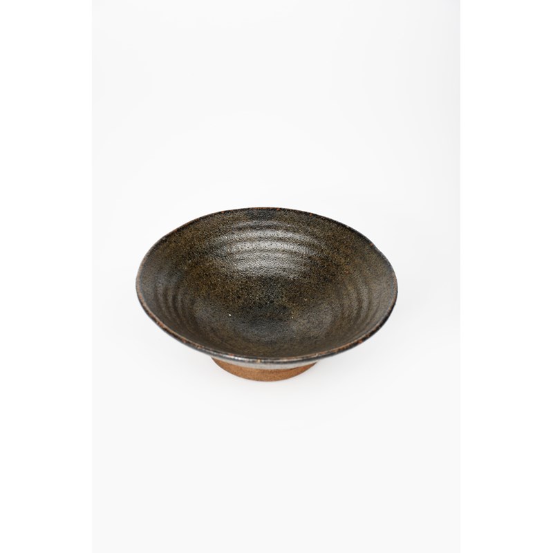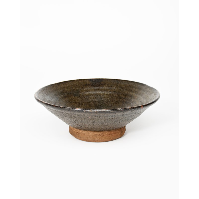 a stoneware footed conical bowl, covered to the foot in a rich, dark brown speckled glaze, impressed seal mark, painted CEL, 20.5cm. diam.
