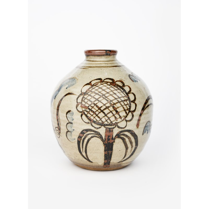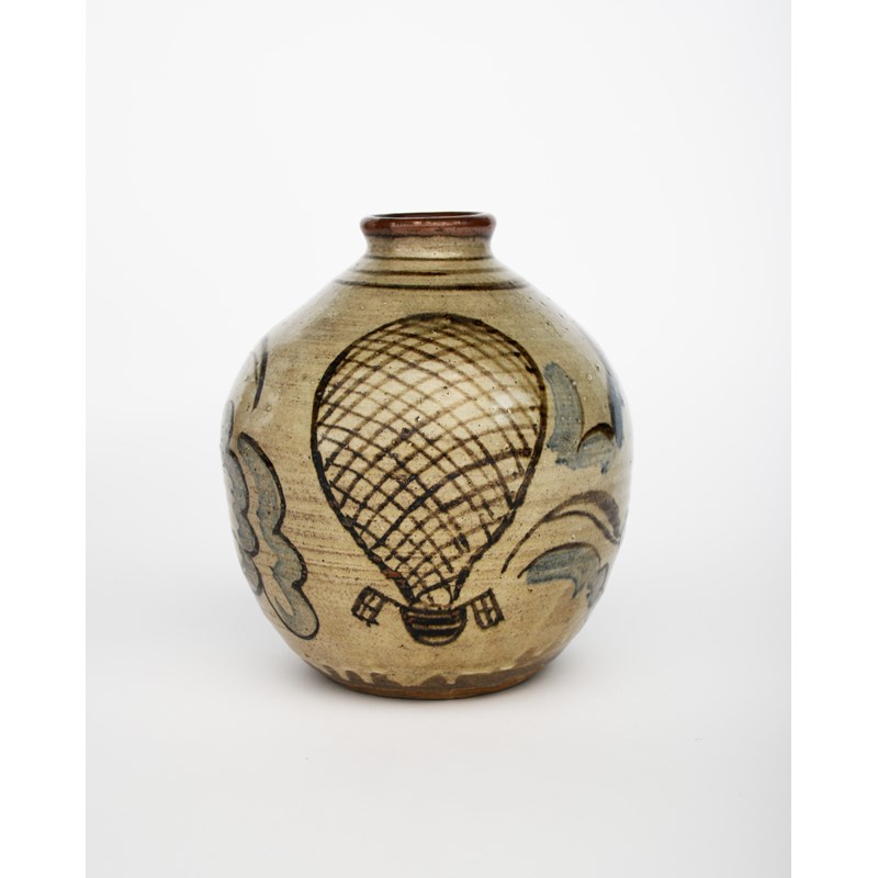 'Sun and Air' a fine stoneware vase, painted with a hot-air balloon flying amongst seagulls and clouds, the reverse a large sunflower. rust on an oatmeal ground highlighted with blue, impressed seal mark, 22.5cm. high
