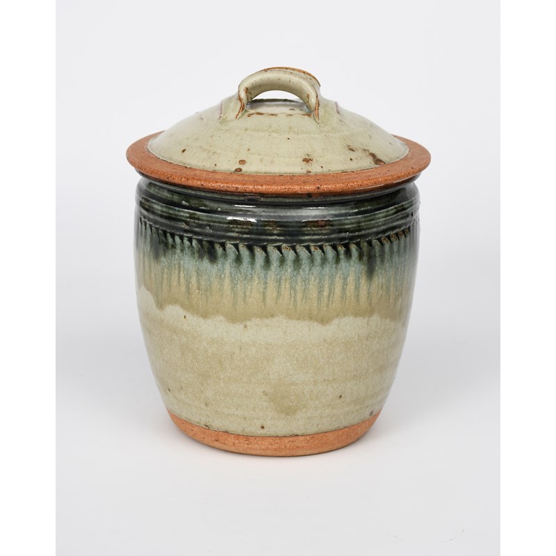 a stoneware jar and cover, swollen cylindrical form with simple incised bands, the shallow domed cover with loop handle, covered to the rims with an ash glaze, unsigned, 25cm. high