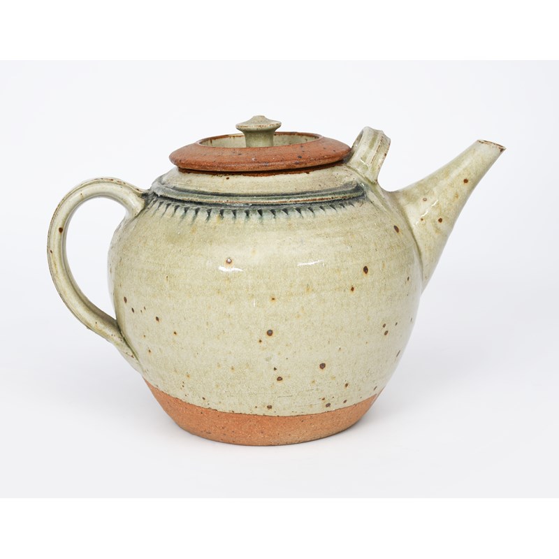 a large teapot and cover, ovoid with flat cover, the body with simple band of incised decoration, covered to the base with a speckled ash glaze, painted B to base, 21cm. high