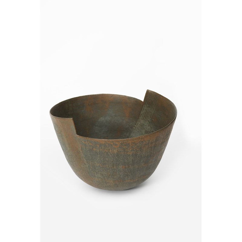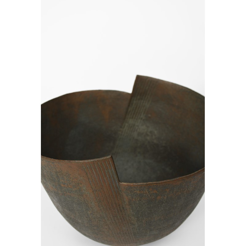 a hand-built stoneware vessel, the rounded bowl with cut angular top rim, with incised column decoration, matt black with rust and green impressed seal mark, 24.5cm. high