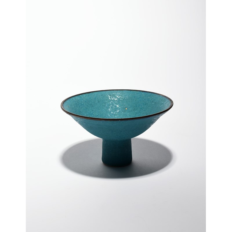 a porcelain stem bowl, covered in a pitted, matt blue glaze, the rim highlighted with bronze impressed seal mark, 9.5cm. high. 16.5cm. diam.