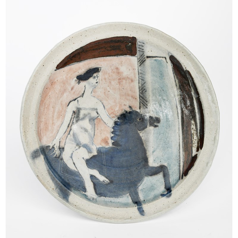 Circus a stoneware charger dated 2005, painted to the well with a female bareback horse rider, in blue and pinks on an escallonia ash glaze signed, titled and glaze listed on foot rim 05/93, 29cm. diam.