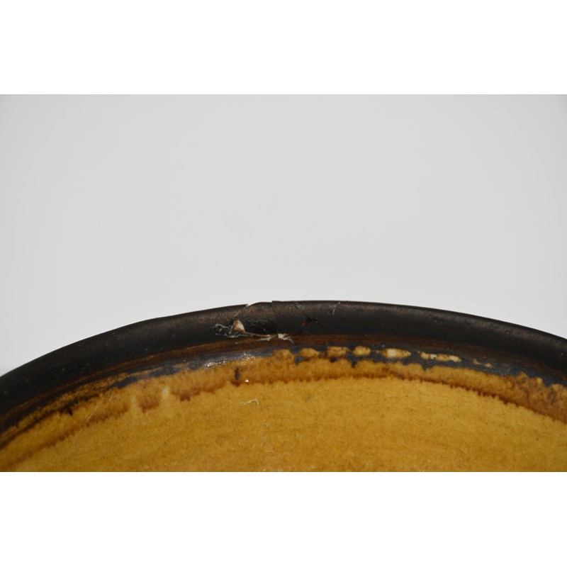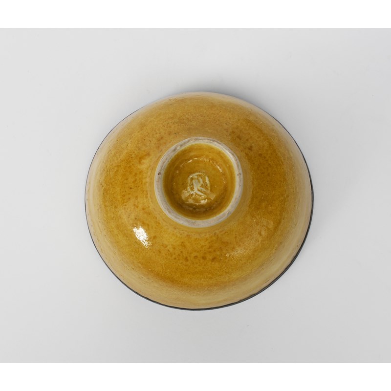 a porcelain footed bowl with bronze rim, covered to the foot with a mustard yellow glaze impressed seal mark, small repaired chip to top rim, 15.5cm. diam, 10cm. high