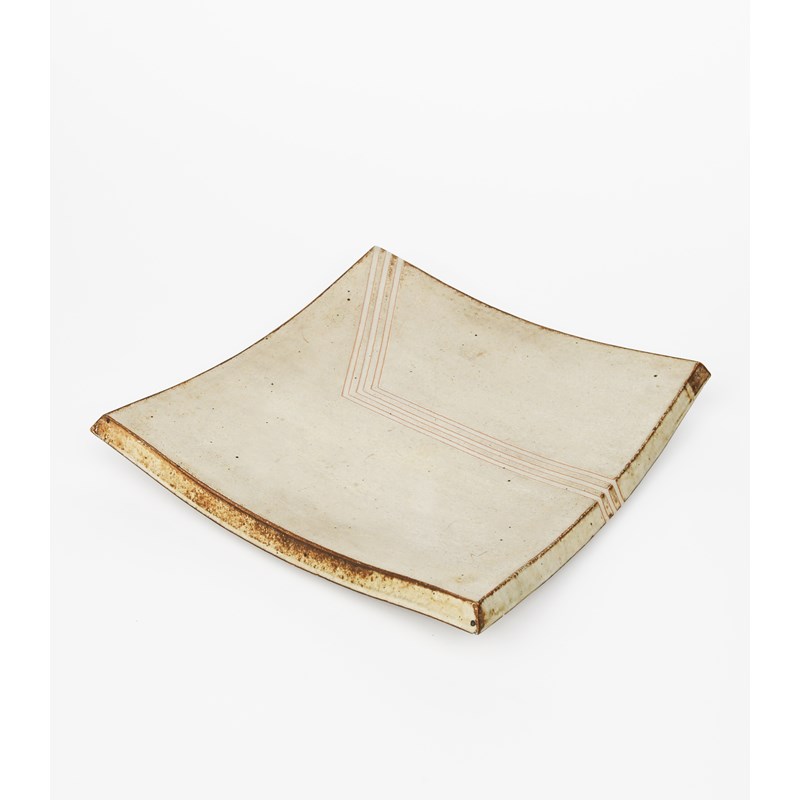 a stoneware platter, dated 1988, near square section with shallow bowl, resist decorated with simple geometric design in salmon on a speckled mushroom glaze impressed seal mark with date, two small chips to back surface 37 x 38cm.