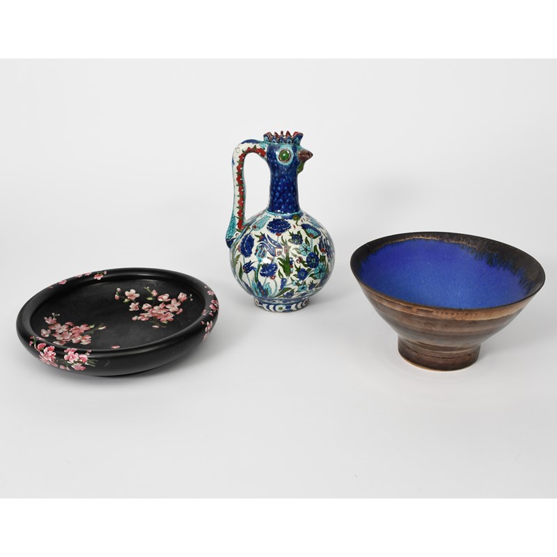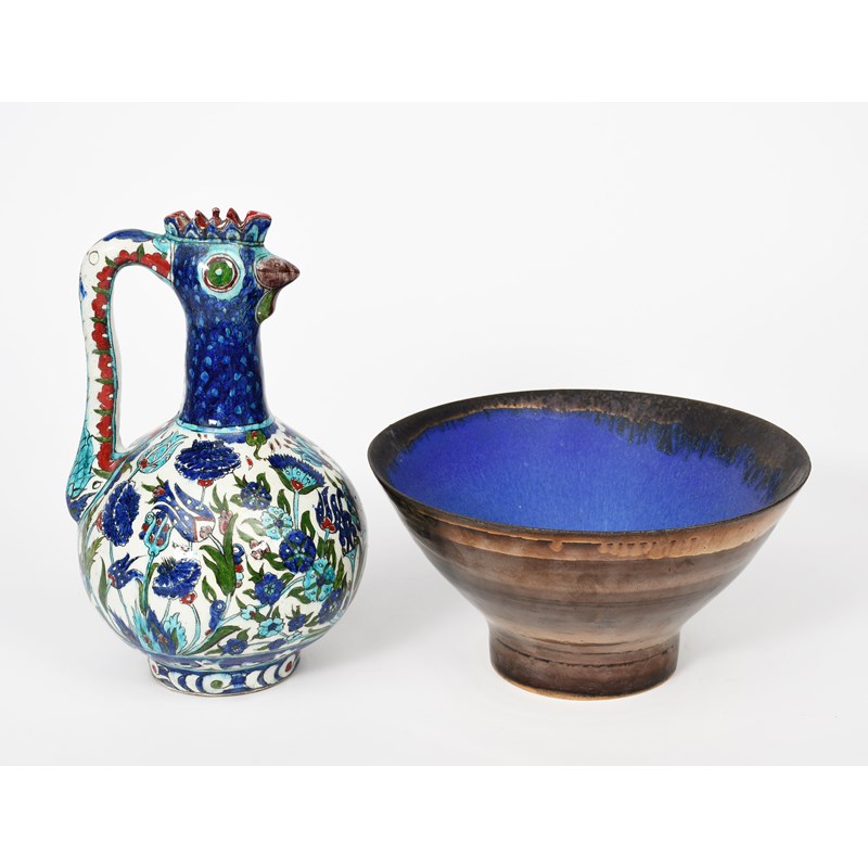 An Iznik style pottery ewer, bellied form with pulled handle, the neck and spout modelled as a bird's head, the swollen body painted with flowers in blue, turquoise, red, green and aubergine on a white ground, a Sarah Perry studio pottery bowl, and a Carlton Ware floating bowl, unmarked, 31cm. high (3)
