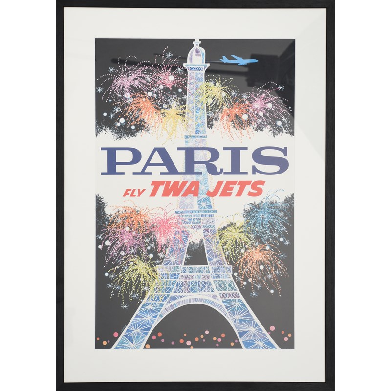 a lithographic poster on paper, printed in the USA, depicting the Eiffel Tower lit by firework explosions, framed