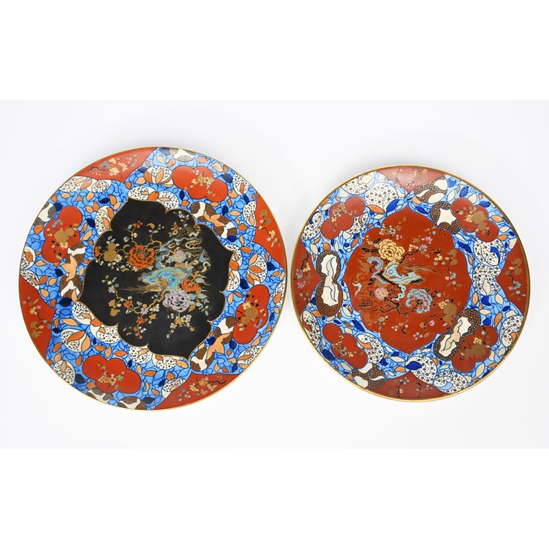 A Bursley Ware wall charger designed by Charlotte Rhead, pattern no.1326, tubeline decorated with a floral border in coral red, blue and orange on a cream ground, the well a chinoiserie panel of a bird amongst blossom designed by Horace Wain, and another wall charger smaller in the same design printed factory marks, 41cm. diam. (2)