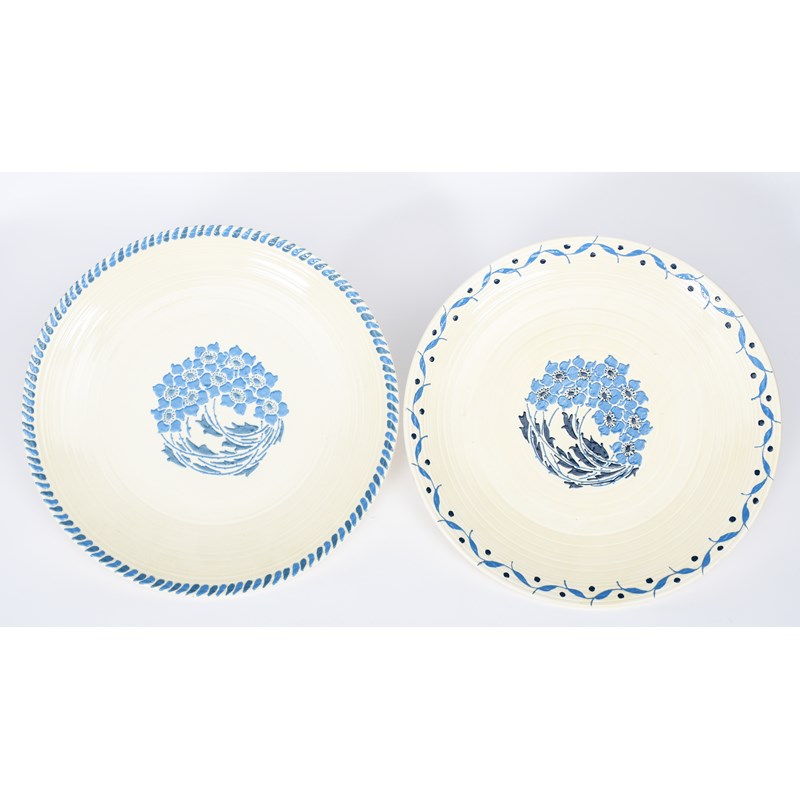 An unusual near pair of Blossom chargers by Charlotte Rhead, pattern no.3218, tubeline painted to the well with a panel of flowers in blue, one charger with a band of leaf and berry to the border, the other with simple blue ash design, printed factory mark, painted facsimile signature, 44cm. diam. (2)