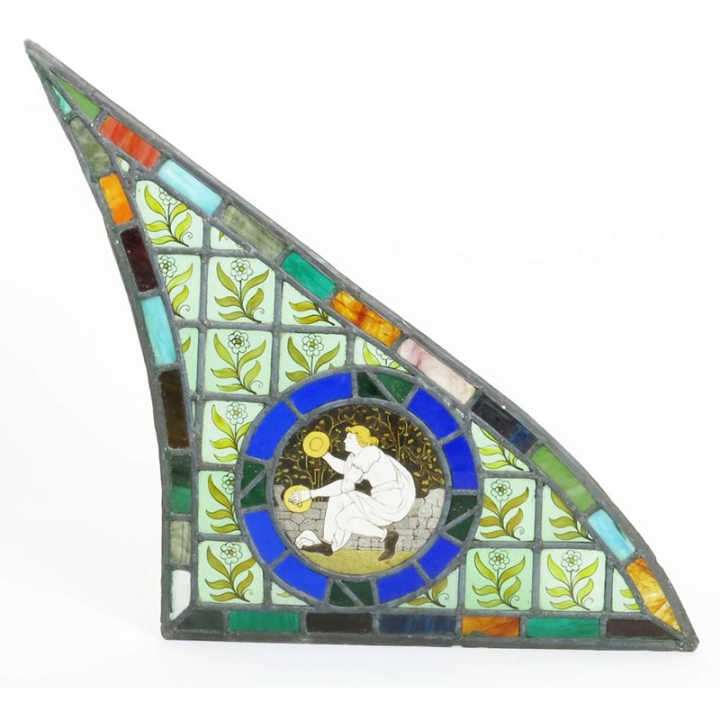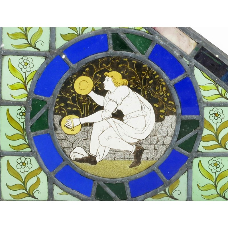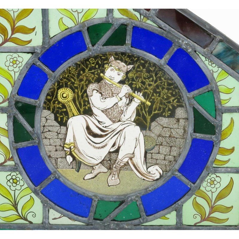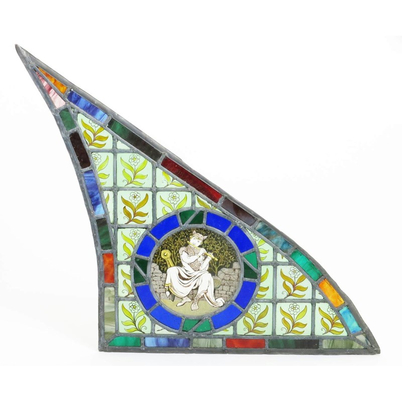 A pair of stained glass windows possibly William Ramsey the design attributed to John Moyr Smith, the shaped triangular windows set with circular painted panel of a seated piping figure, the other with a figure crouching and playing the cymbals unsigned 90cm. wide