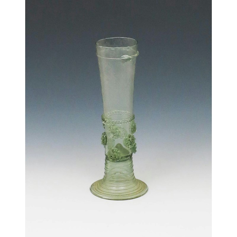 A soda glass vase in the manner of James Powell & Sons Whitefriars, medieval style with flaring cylindrical form with applied prunt and tear decoration, a John Walsh Walsh Leaf pattern vase designed by Clyne Farqharson and two other glass items, etched mark, 19.5cm. high
