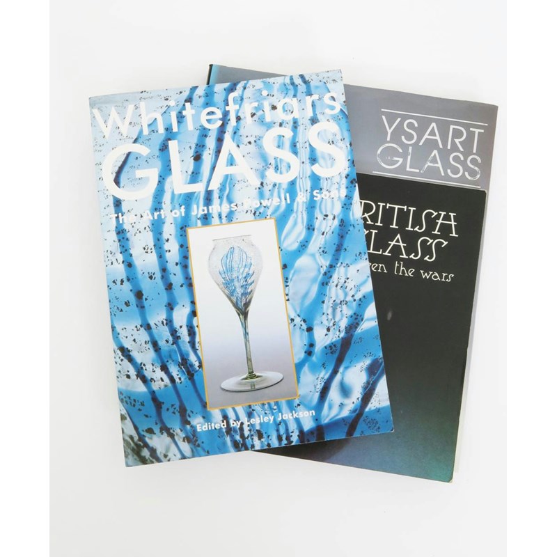 A collection of reference books on Arts and Crafts and 20th century design, including British Glass Between the Wars, Whitefriars Glass edited by Lesley Jackson, Ysart Glass, and Leerdam Unica 1923-1987 by Marc Hiermans , Charles Rennie Mackintosh by Thomas Howarth, The Dr Thomas Howarth Collection of Charles Rennie Mackintosh Christie's King Street catalogue, Liberty Design by Barbara Morris