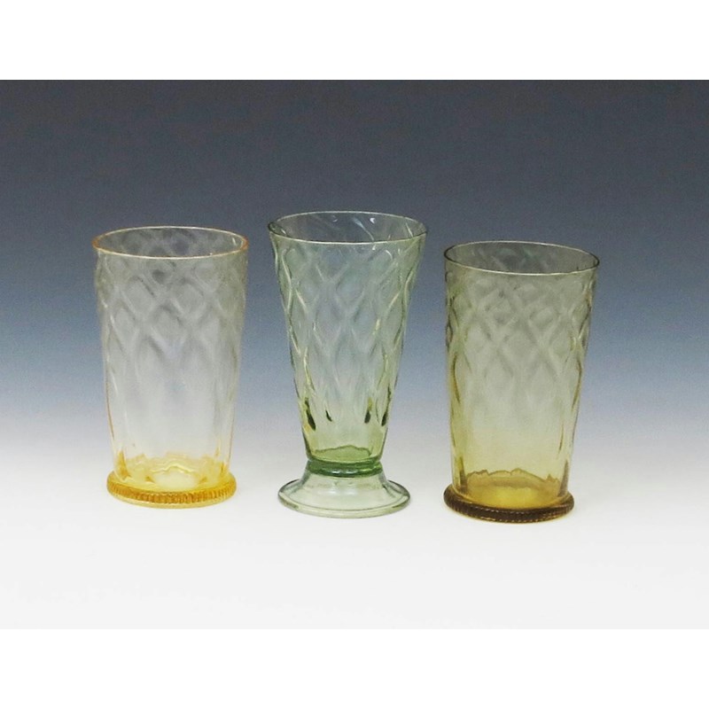 A James Powell & Sons Whitefriars amber glass Woodchester vase, designed by Harry Powell, another similar and a footed Sea Green Woodchester vase unsigned 14cm. high