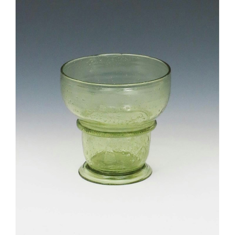A James Powell & Co Whitefriars glass vase designed by Edward Spencer, swollen, cylindrical form, the pale green glass body with air bubble inclusions and applied ring, on applied foot unsigned 12.5cm. high