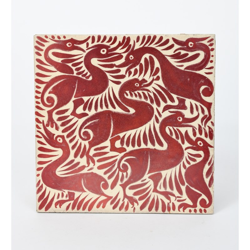 A William De Morgan Fantastic Ducks tile, painted in ruby lustre on a cream ground, impressed L