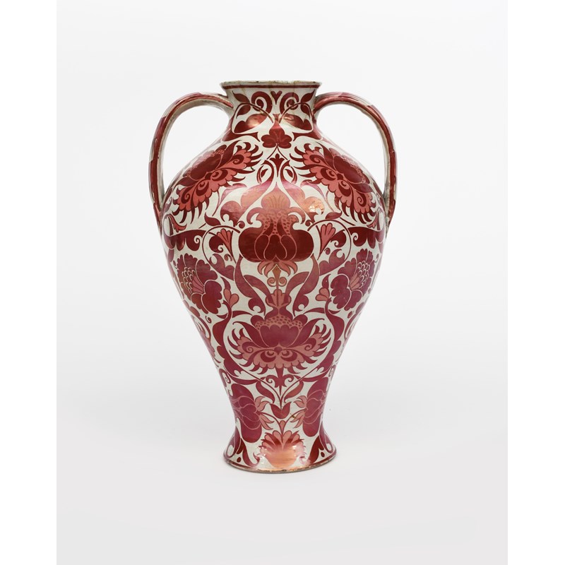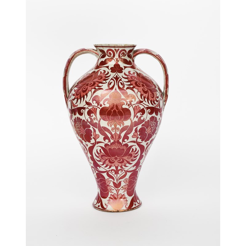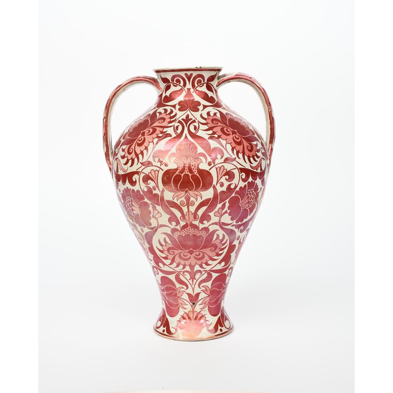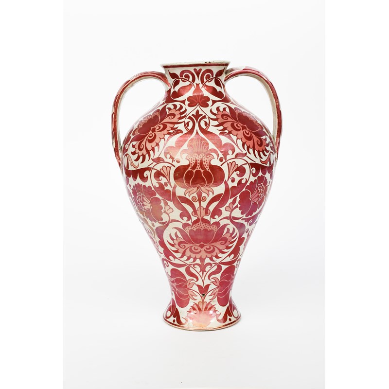 A large William De Morgan twin-handled vase probably painted by Halsey Ricardo, baluster form with applied handles, painted with flowers and foliage in ruby lustre and pink on a white ground, impressed factory mark, painted HR monogram, repaired damages, 41cm. high
