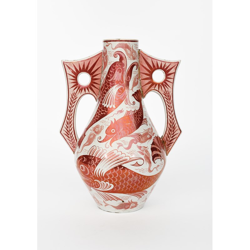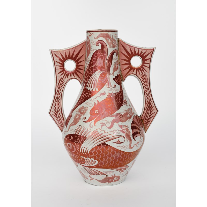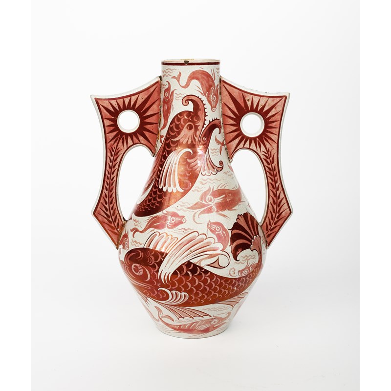 A large William De Morgan vase, ovoid with tapering cylindrical neck, applied with large angular handles, painted with a shoal of stylised classical fish swimming , in ruby lustre and pink on a white ground, impressed William De Morgan Sand's End mark, repaired damages, 45cm. high