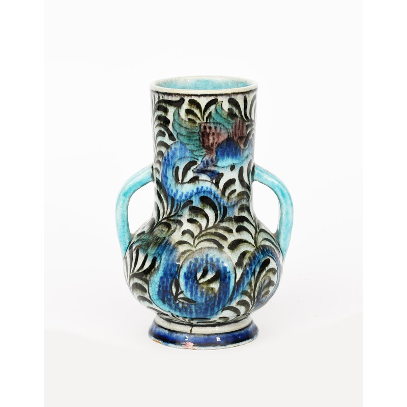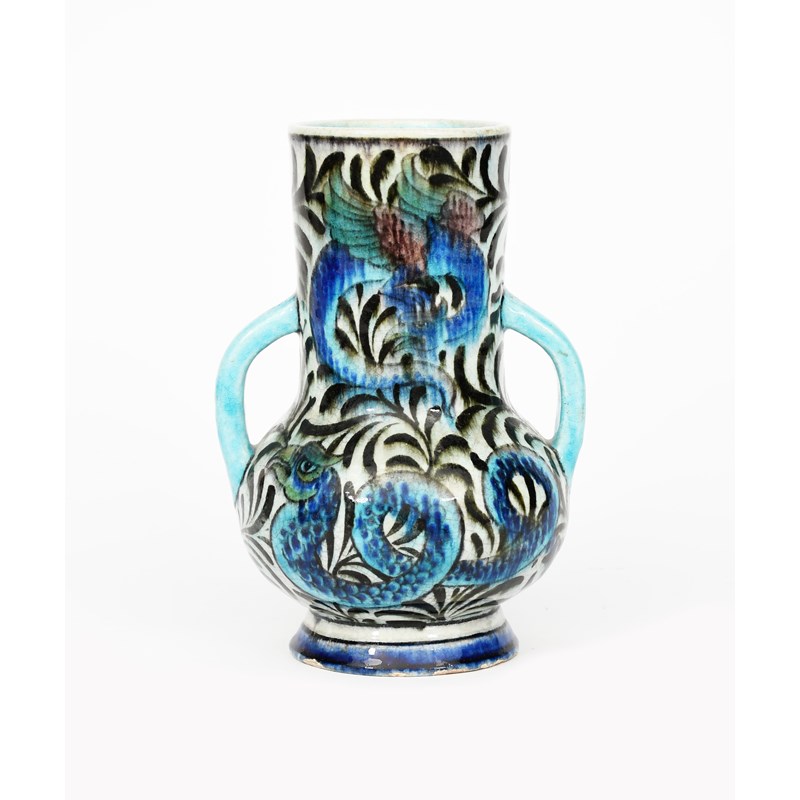 A William De Morgan Persian twin handled vase, ovoid with cylindrical neck, painted with a serpent and winged dragon in blue, turquoise, green and aubergine on a white ground, unsigned, small chips to foot, 22cm. high