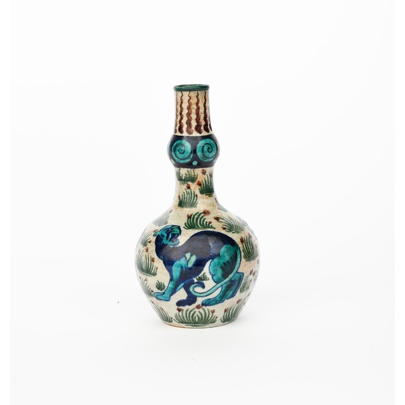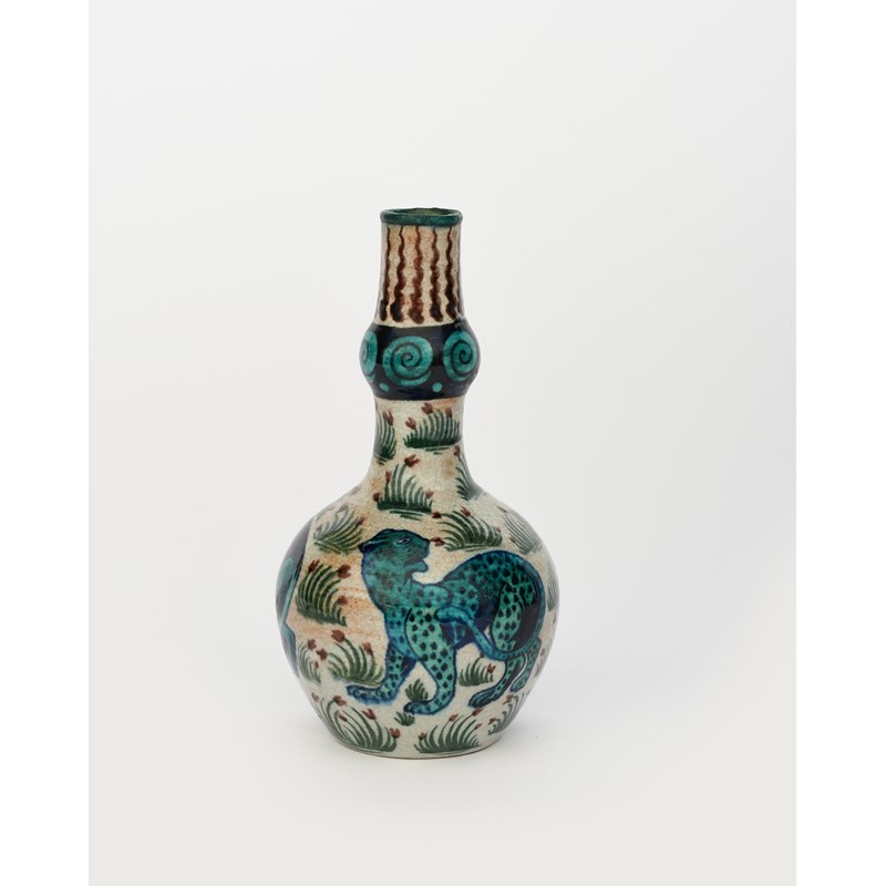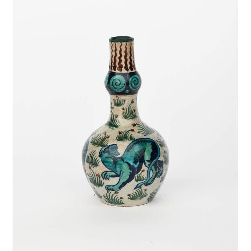 A William De Morgan Persian bottle vase, ovoid with knopped cylindrical neck, painted with a frieze of leopards, amidst clumps of flowering grasses, the neck with bands of geometric pattern in blue, turquoise, green and aubergine on a white ground, impressed tulip mark, professional restoration to top rim, 19.5cm. high