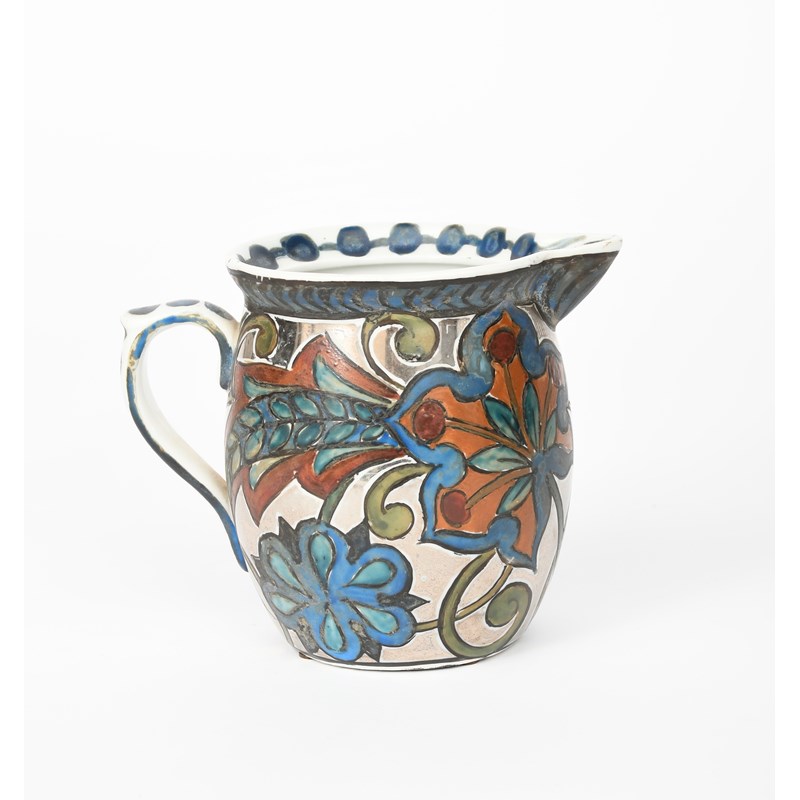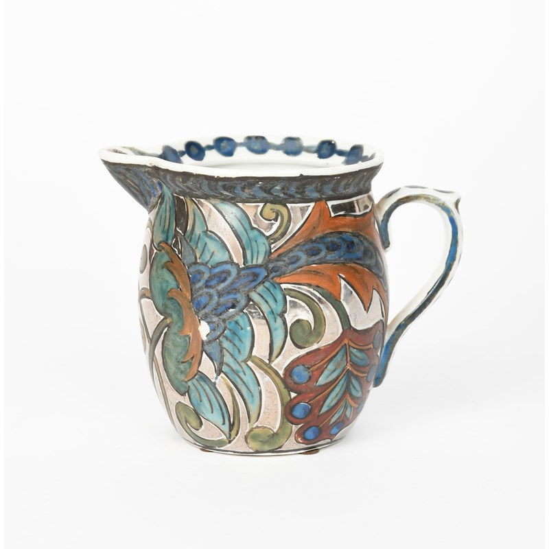 A John Pearson pottery jug, swollen cylindrical form, painted with stylised exotic flowers in colours on a silver ground, over white, painted monogram, 13.5cm. high