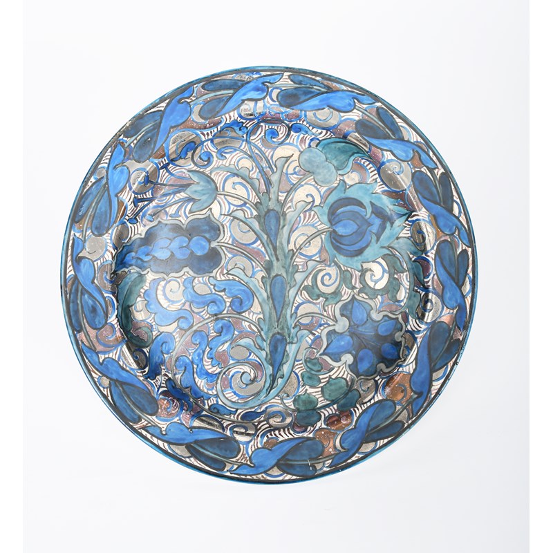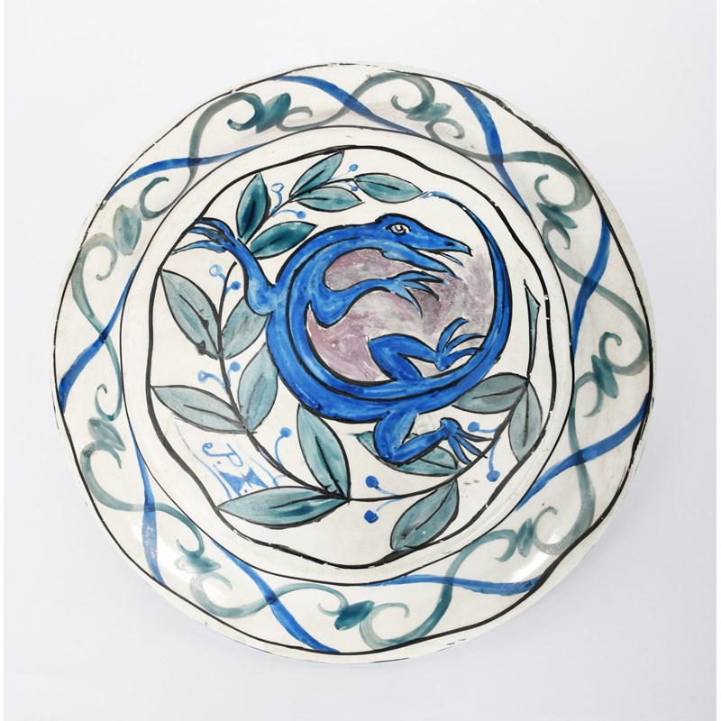 A John Pearson pottery charger, painted with flower and foliage in shades of blue, silver and purple lustre on a white ground, the reverse painted with a large lizard, painted JP monogram, 32.5cm. diam.