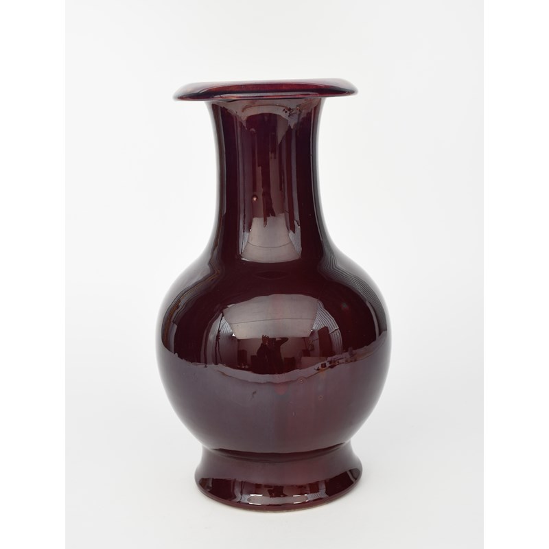 A Chinese flambe baluster vase, the ovoid body with cylindrical neck flaring top rim, covered in a flambe glaze with purple streaks, unsigned, drilled base, 43cm. high