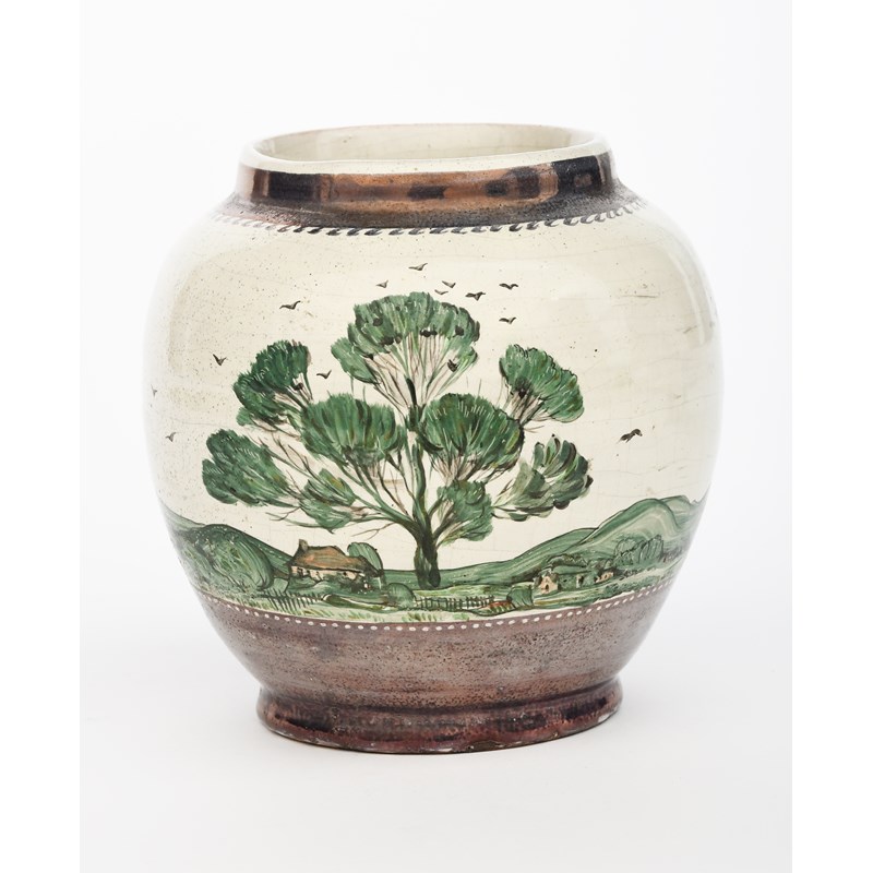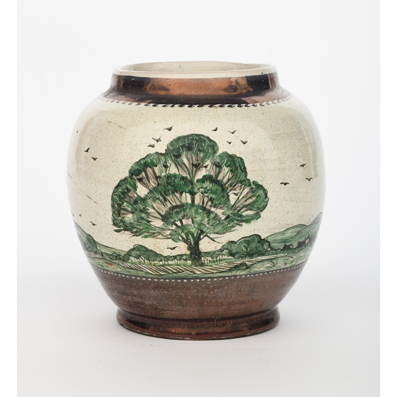 An unusual Millwall Pottery stoneware vase by Alfred Powell, numbered 131, shouldered, ovoid form, painted with a cotswold landscape, a church and houses amongst fields with a flock of crows flying and roosting in a large tree, in colours on a white ground between purple lustre bands, incised M, painted artist monogram and 131, 15.5cm. high