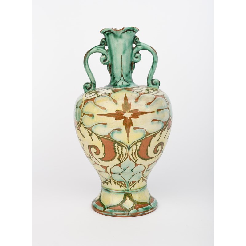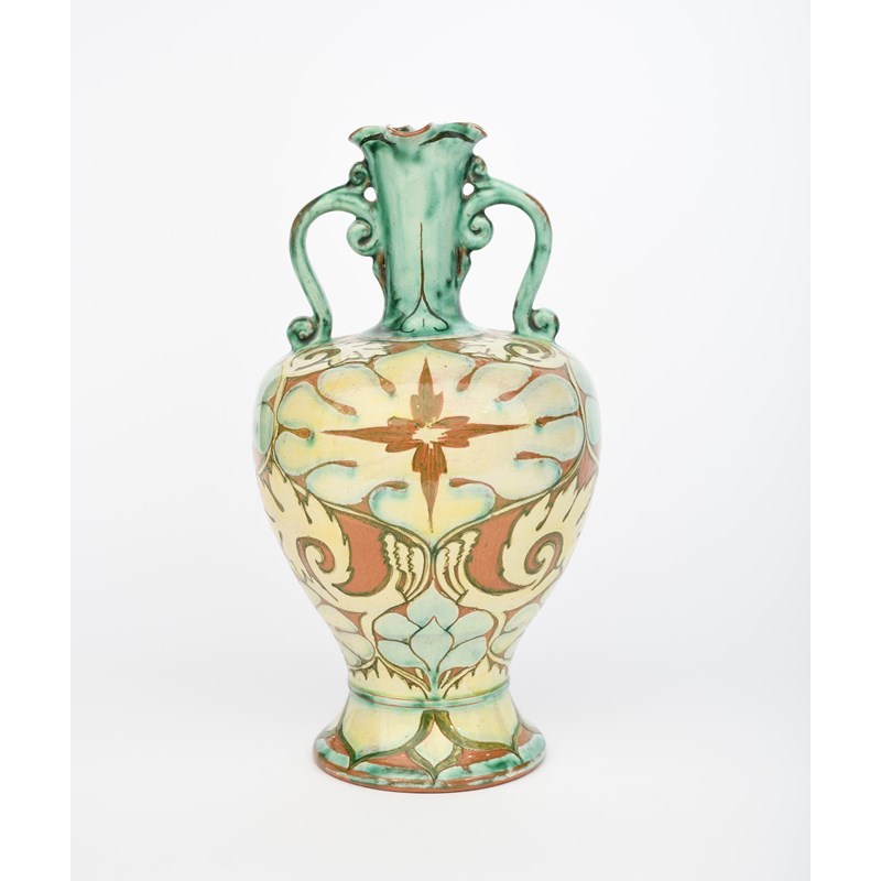 A Della Robbia Pottery vase by Arthur E Bells and probably William Warwick, dated 1898, shouldered form with twin-scroll handles, incised and painted with stylised flowers and foliage in turquoise, yellow and green on a tan ground, incised mark and AEB monogram, painted W and dated 1898, 29.5cm. high