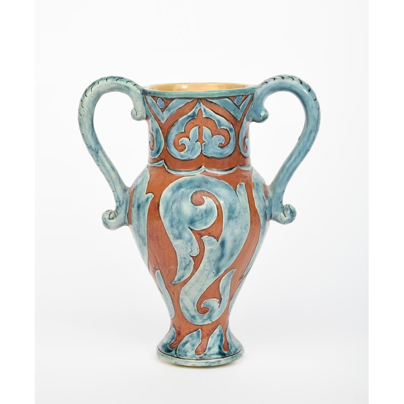 A Della Robbia Pottery vase by John Fogo, shouldered form with applied twin scroll handles, incised with scrolling foliage in blue on a terracotta ground, incised factory mark and JF monogram, museum restored neck, 22cm. high
