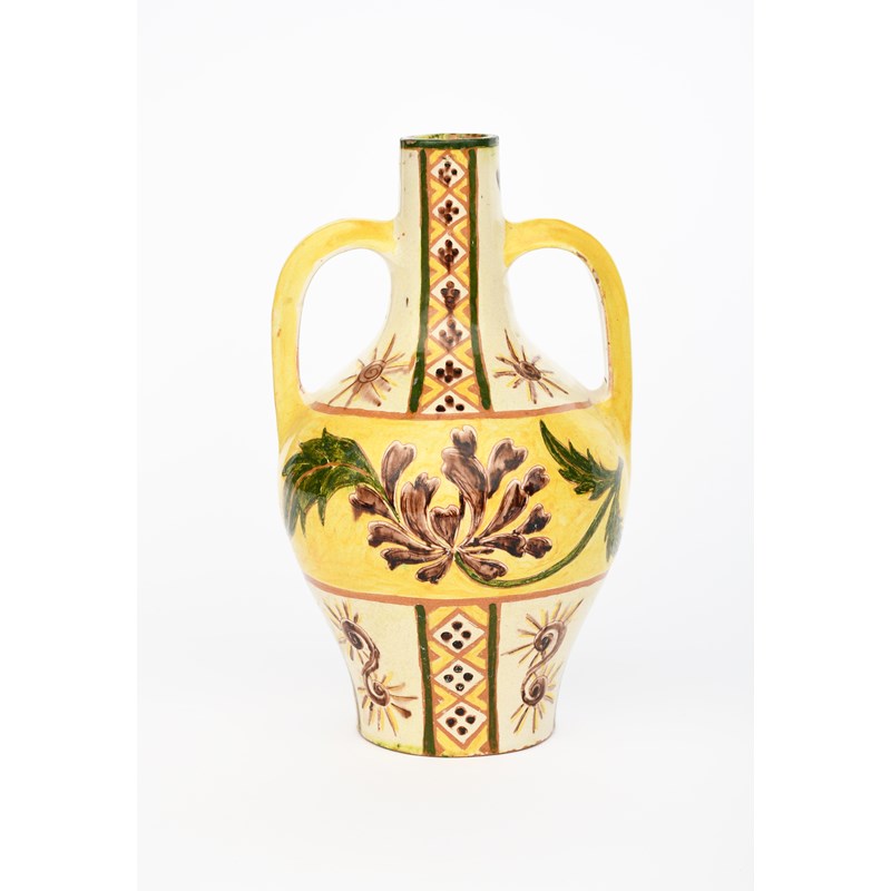 A Della Robbia Pottery Moorish vase by Miss Gwendoline Buckler, shouldered, twin-handled form, painted with a band of flower stems in aubergine, green and yellow on a cram ground, between stylised panel borders, incised factory mark, painted GEMB monogram, 25cm. high