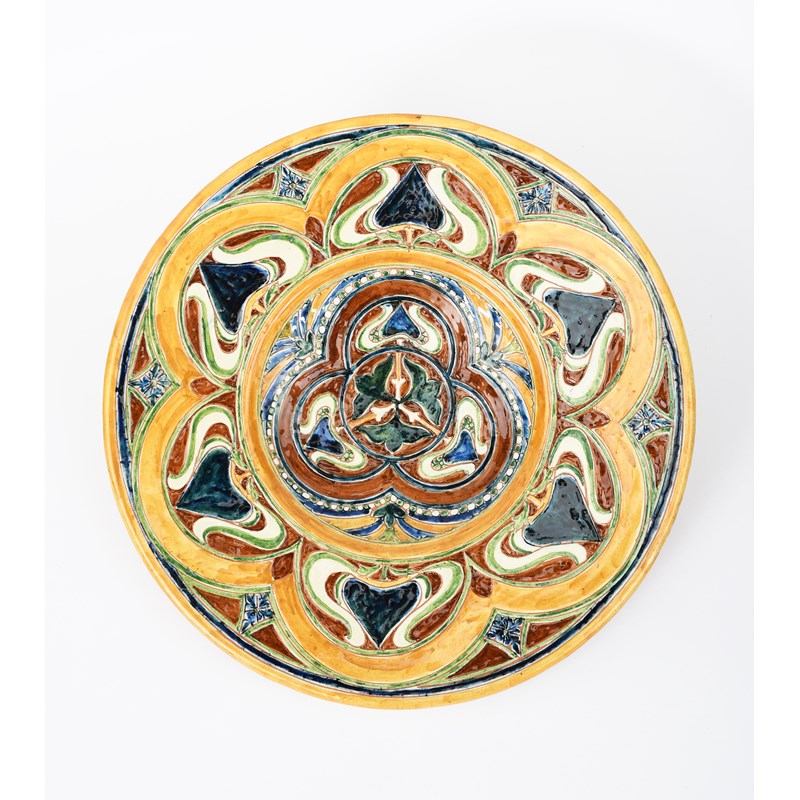 A Della Robbia Pottery charger by Annie Smith, incised and painted with radiating Art Nouveau flower stems, the rim with similar stems, in yellow, blue, green and ochre, incised factory mark, painted AS monogram, 38cm. diam.