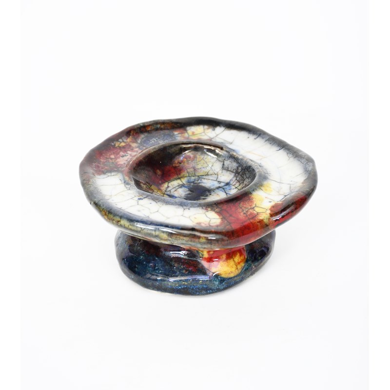 A Royal Doulton Chang mushroom dish designed by Charles Noke and Harry Nixon, amorphic form, covered in a thick running white and flambe glaze with yellow and blue patches, painted Doulton mark, Noke signature and HN monogram, 13cm. diam. 5cm. high